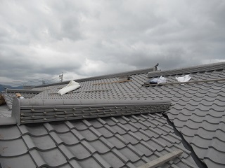 セメントプレス瓦で葺かれた屋根の葺き替え工事です。