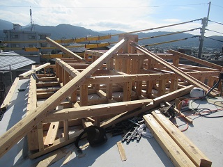コンクリート躯体打設が完了したので銅板屋根下地の木工事を行なっています。