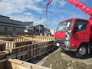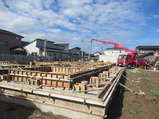 基礎ベースコンクリートが終わり、立上りのコンクリート打設中です。