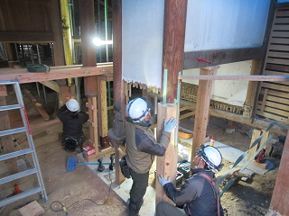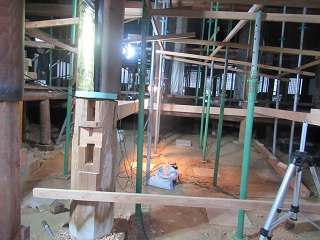 内陣床の足固め及び柱の根継ぎの施工中です。