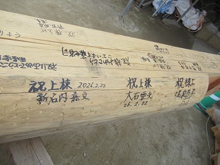 丸太組み始め式が行われ、参加者の方々が丸太に祝いの寄せ書きをされました。